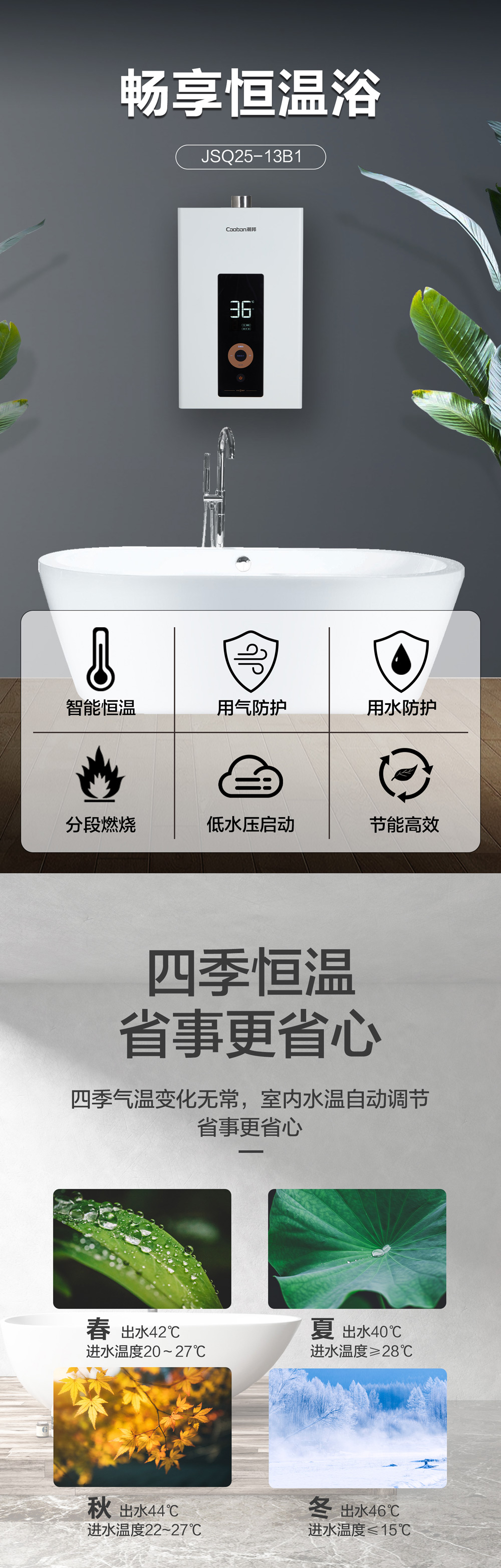 智能恒溫,用氣用水防護(hù),低水壓啟動(dòng)。